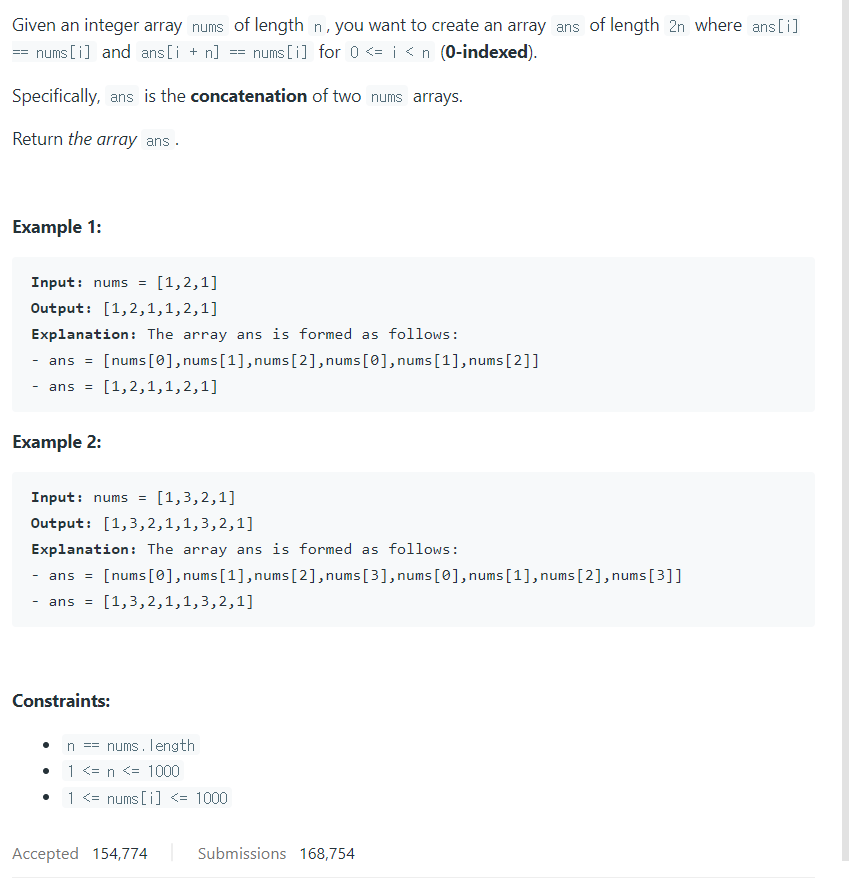 길이 n의 정수 배열 num을 지정하면 길이 2n의 배열 ans를 생성하려고 합니다. 여기서 0 <= i < n (0-168)에 대해 ans[i] == nums[i + n] == nums[i] == nums[i]입니다.