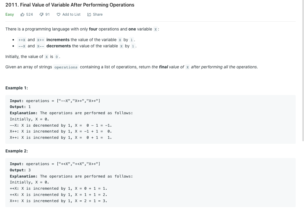 const finalValueAfterOperations = (operations) => operations.reduce((acc, curr) => curr[1] === "+" ? ++acc : --acc, 0)